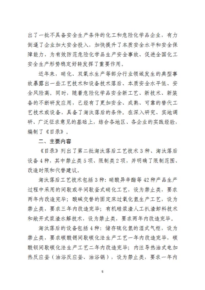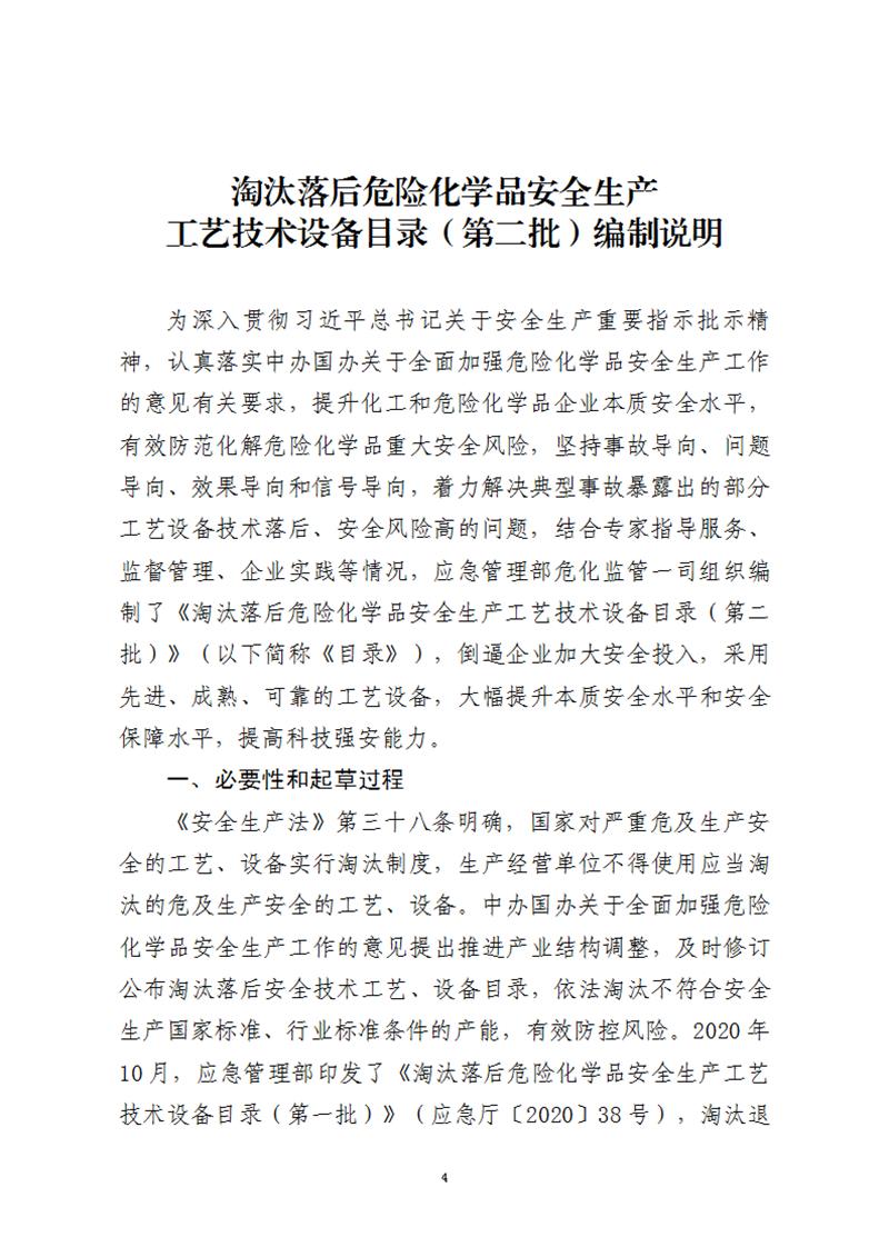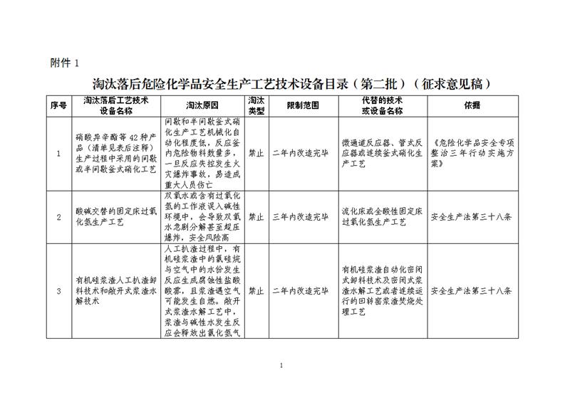 為認(rèn)真落實中共中央辦公廳、國務(wù)院辦公廳《關(guān)于全面加強(qiáng)危險化學(xué)品安全生產(chǎn)工作的意見》有關(guān)要求,提升化工和危險化學(xué)品企業(yè)本質(zhì)安全水平,有效防范化解危險化學(xué)品重大安全風(fēng)險,應(yīng)急管理部?;O(jiān)管一司組織制定了《淘汰落后危險化學(xué)品安全生產(chǎn)工藝技術(shù)設(shè)備目錄(第二批)》(征求意見稿)和編制說明(見附件1)。