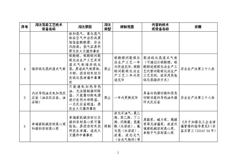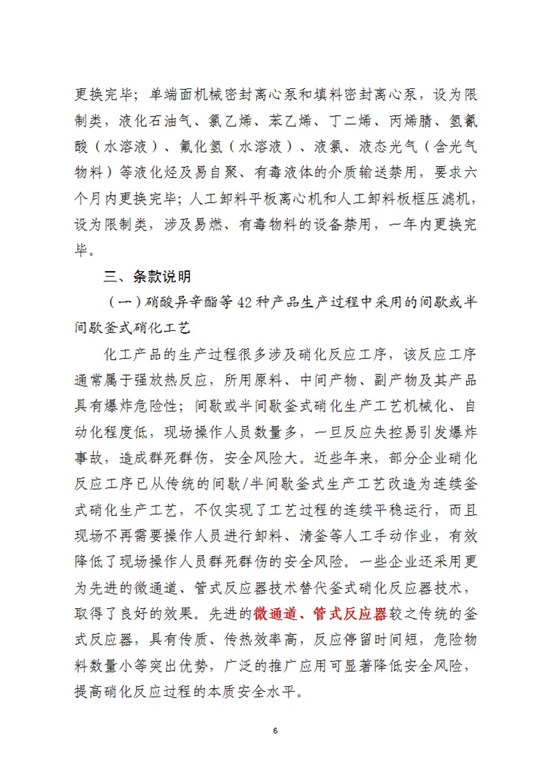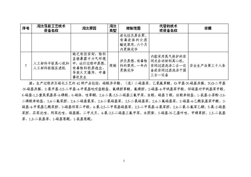 淘汰落后工藝技術(shù)設(shè)備名稱:1、硝酸異辛酯等42種產(chǎn)品(清單見表后注釋)生產(chǎn)過程中采用的間歇或半間歇釜式硝化工藝。